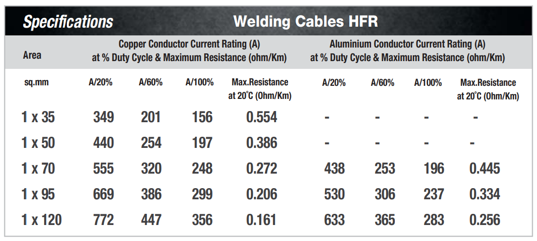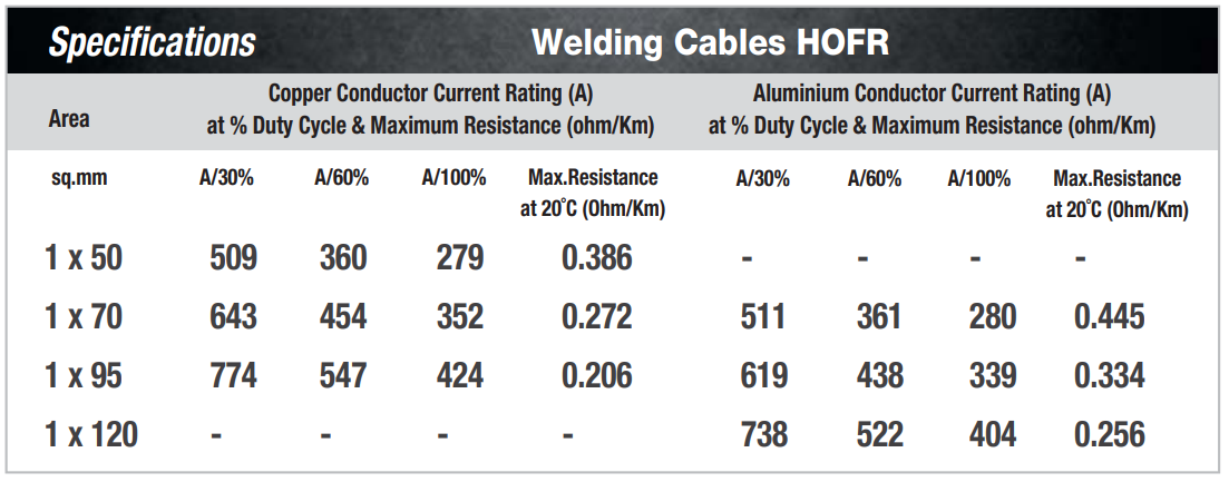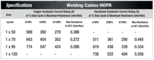 ESAB HFR (Heavy Flexible Rubber) and HOFR (Heavy Oil-Resistant Flexible Rubber) welding cables are designed for high-performance welding applications. Here are the specifications and features for both types: